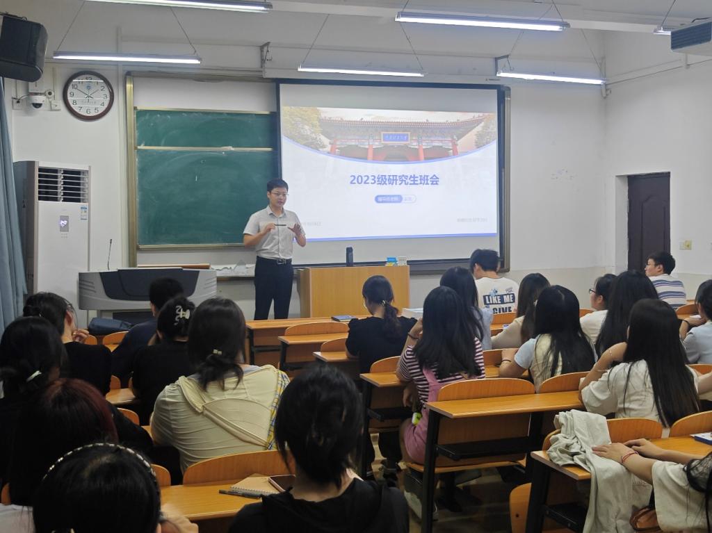 于9月6日下午19:00在一号教学楼1209教室召开“2023级研究生新生班会”。出席人员有研究生辅导员袁凯、学院研究生会主席张皓飞、章文俊、2022级研究生团支书彭学义。