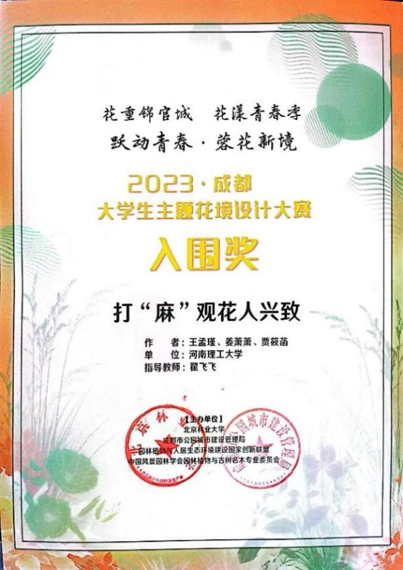 2023年上半年,由北京林业大学等主办的“2023·成都大学生主题花境设计大赛”征集设计作品。全国105所高等与大专院校覆盖1082人的有效参赛作品449组。由翟飞飞老师指导的设计作品《打“麻”观花人兴致》荣获入围奖,是wepoker官网