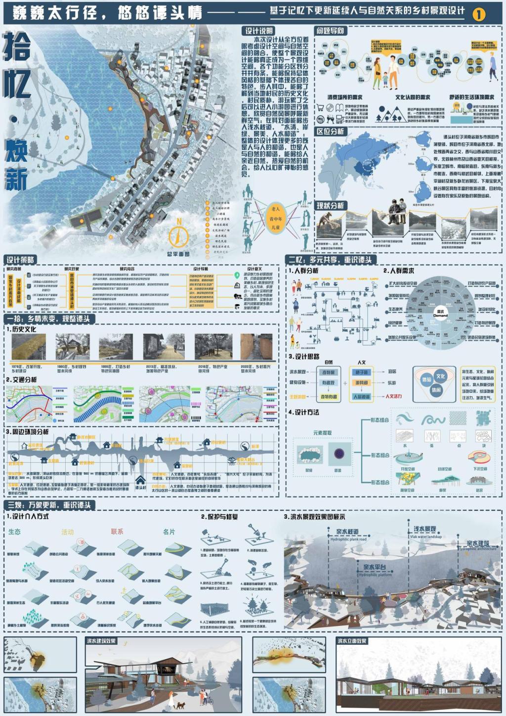 樊泽鑫等三位同学的作品“沁古叠今——集璞舍”获得国赛二等奖,该作品基于韧性视角的乡村更新设计,以武陟县中封村文旅产业发展为例,以“璞”为主题,构建东方院落、寂隐生活。以“花生之乡,文化旅居”为核心,以宅院的形制,构建小亭与院落,顺应当下的生活方式,从衣食住行的生活方式中探寻文化旅居更多的可能性,结合当地民族文化实现韵味提升,在打造新旧融合的过程中保留本土韵味。