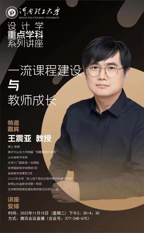 特邀山东大学工业设计专业王震亚教授作题为《一流课程建设与教师成长》专题讲座。由学院副院长闫海燕教授主持,学院领导班子成员、相关专业教师和研究生、本科生共140余人通过腾讯会议的形式在线参加。
