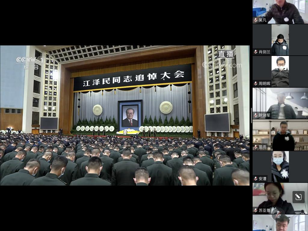 随着哀乐的奏响,研究生党支部全体同志起立肃静,并佩戴白色胸花,怀着沉痛的心情,为江泽民同志默哀,以表达无限追思。全体同志通过线上直播画面收看江泽民同志追悼大会,深切缅怀江泽民同志的卓越功勋和杰出理论贡献,深刻感悟江泽民同志的优秀品格和高尚风范,深入学习江泽民同志为党和人民事业不懈努力的奋斗精神。中共中央总书记、国家主席、中央军委主席习近平在追悼大会上致悼词期间,全体同志认真聆听,与全国人民共同回顾江泽民同志光辉伟大的一生,共同追思江泽民同志为中华民族伟大复兴事业而倾尽心血的奋斗历程。我们将初心融入灵魂、把使命扛在肩上,决心以不负盛世、时不我待的姿态逐梦前行,以不负时代、任重道远的担当持续奋斗。