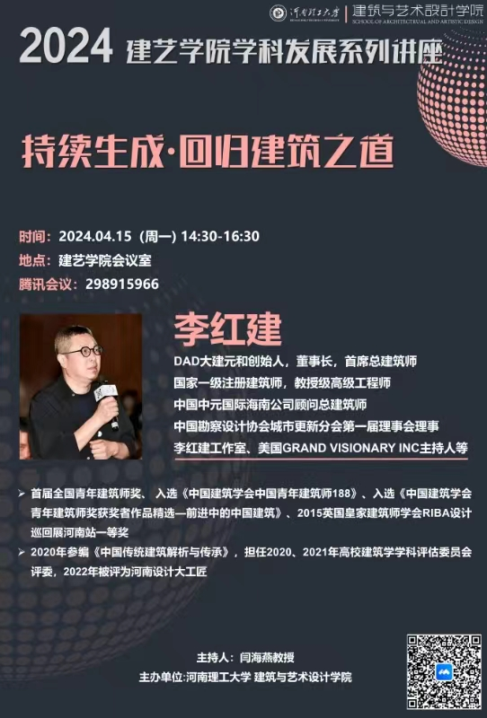 为进一步提升学院教师和学生的科研能力与专业素养,推进教育教学事业高质量发展,4月15日下午,DAD大建元和设计创始人李红建教授在学院大会议室开展了“持续生成·回归建筑之道”的学术讲座,讲座由校教师中心主办、wepoker官网