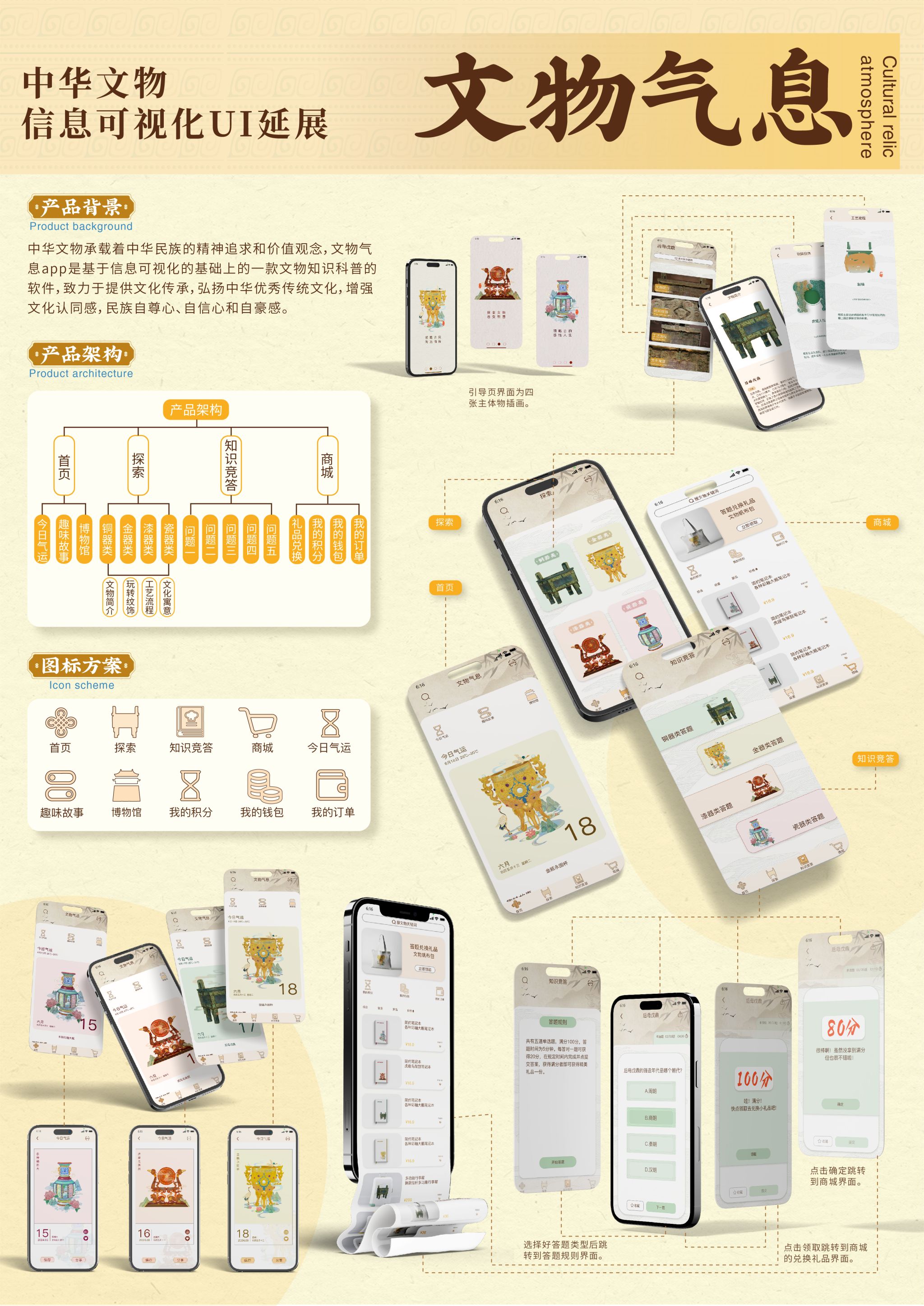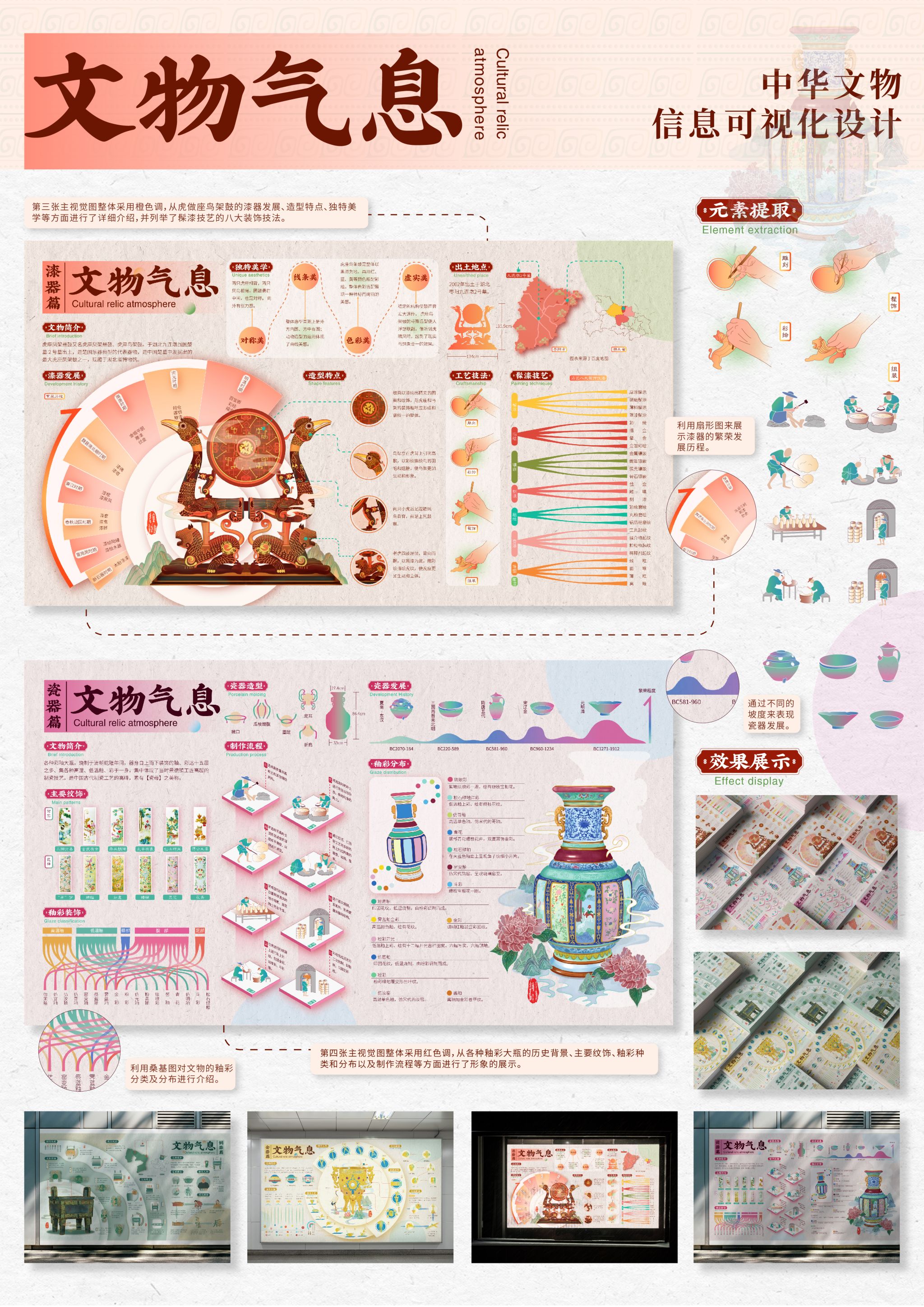 师生荣获包括国赛优秀指导教师奖、空间设计类二等奖、视觉传达类一等奖等多项荣誉。其中,王璐、薛曼君和徐海涛获得国赛优秀指导教师奖。在国赛普通高等院校赛道中,吴仔佳同学的《中华文物信息设计》获得视觉传达类一等奖,该设计以信息可视化的方式,深入展示中华文物的独特魅力,让观众快速直观地了解中国传统文化;李晓静同学的《夔-安阳市商场设计》获得空间设计类二等奖,作品巧妙融合当地青铜文化,以夔龙纹的“流动”为核心,打造一个多功能商场建筑。同时,在河南分赛区,李晓静和陈烁宇同学的《归园慢漫,悠见太行》荣获空间设计类二等奖;林姝洋和余子仪同学的《红军长征》获得红色主题类二等奖;李芷涵、李晓静、张笑笑同学的《回旋之间,别有洞天》获得空间设计类优秀奖。