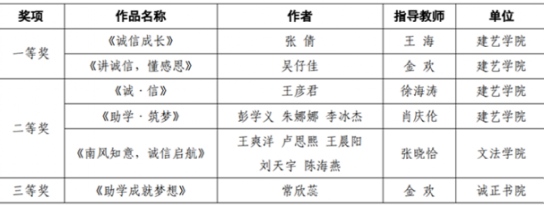 积极参与2023-2024学年度河南省“诚信校园行”学生资助公益广告设计大赛,本次大赛以“树诚信自强风,做励志感恩人”为主题,前后历时6个月。经最终评审,学院推选作品《诚信成长》《讲诚信,懂感恩》2件作品荣获省级一等奖,《诚·信》《助学·筑梦》2件作品荣获省级二等奖。