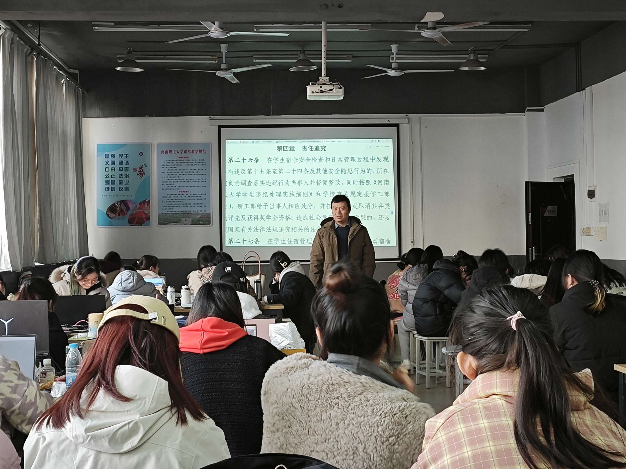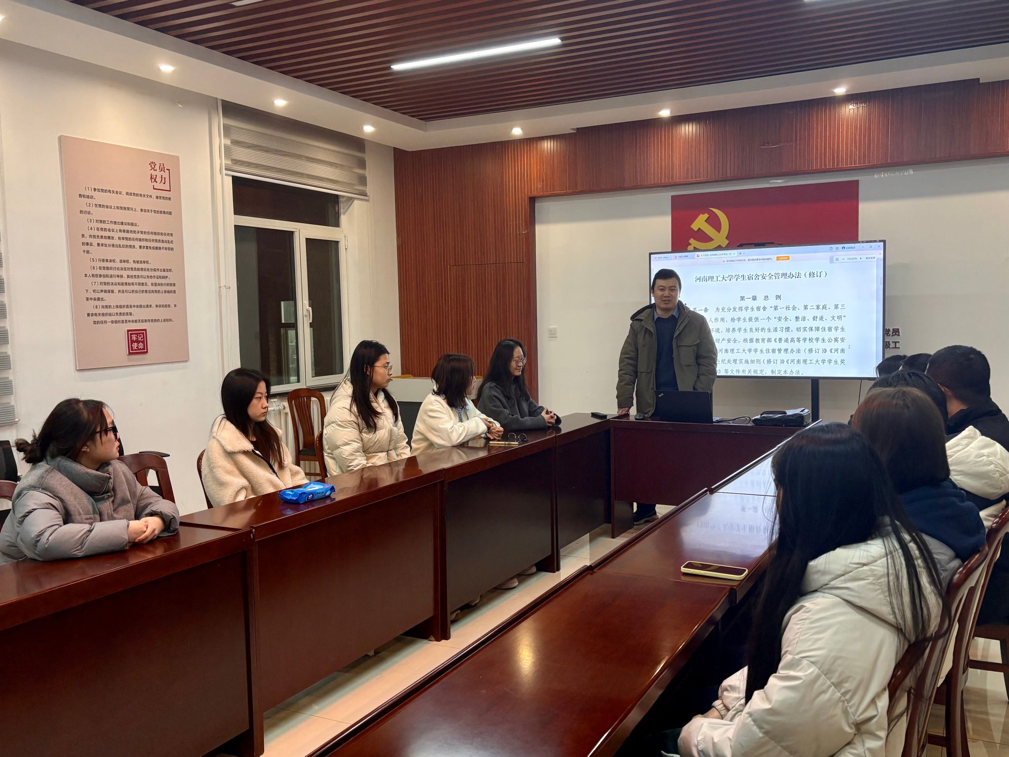 班会活动以文件学习、案例分析、警示教育相结合的形式展开,旨在让全体学生了解掌握学校关于宿舍安全管理相关要求,加强学生宿舍安全建设共创和谐校园。班会上,各年级辅导员带领学生认真学习了《河南理工大学学生宿舍安全管理办法》和《河南理工大学学生住宿管理办法》等文件内容,明确了宿舍安全教育管理的刚性要求。同时,老师们还详细列举真实案例,介绍了近年来身边因为违反学校宿舍管理规定而引发的安全事故以及造成的严重后果,警示全体学生务必提高认识,遵守学校宿舍管理规定,养成好习惯,做到对自己负责,对他人负责,对集体负责。最后,老师们还介绍了学校关于宿舍文化建设的相关内容和要求,鼓励大家要积极响应,要求学生干部、党员骨干要发挥模范表率作用,为构建安全稳定、文明和谐的宿舍环境贡献力量。