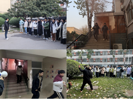 消防科老师首先在学院楼前向学院师生普及火灾预防要点,重点强调了初期火灾识别与避险常识,随后讲解了灭火器“提、拔、握、压”的操作要领,演示了消火栓的使用方法。培训环节结束后,消防实战演练在5号、7号宿舍楼同步开展。随着模拟火警信号响起,同学们按照预定方案,迅速弯腰捂鼻、靠墙行进,沿安全通道有序撤离至指定集结区域,整个疏散过程紧张高效、秩序井然。